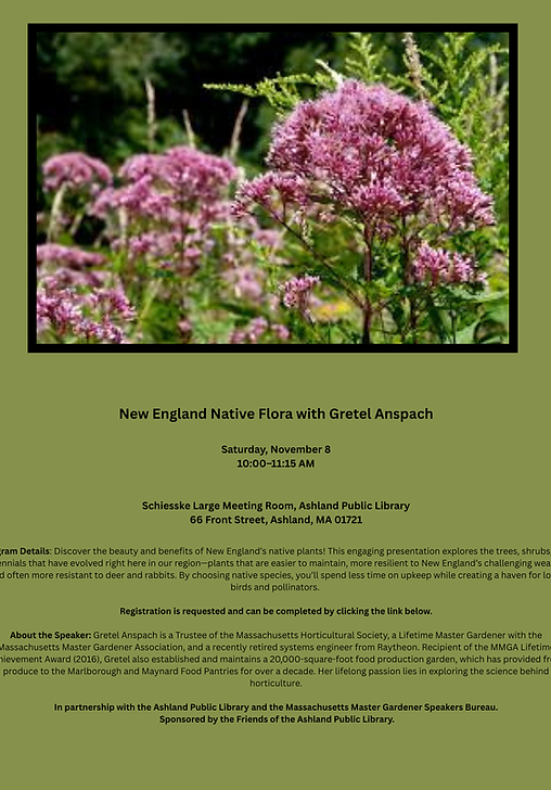 In order to fund plantings in public spaces in Ashland and speaker programs for the public, we hold one or two major fundraising events each year. In addition, we have received some BAA grants from the Board of Selectman and grants from the Ashland Cultural Council.